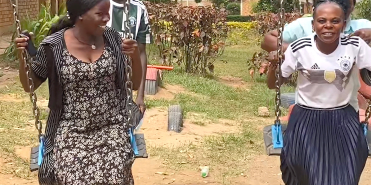 Mustard Seed Primary School teachers experience the thrill of swinging, pushed by their colleagues. See a mixture of excitement and nervous laughter as they enjoy a simple pleasure many of us take for granted.